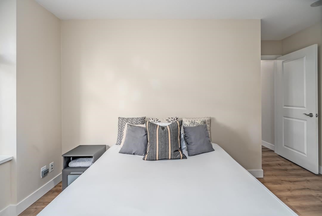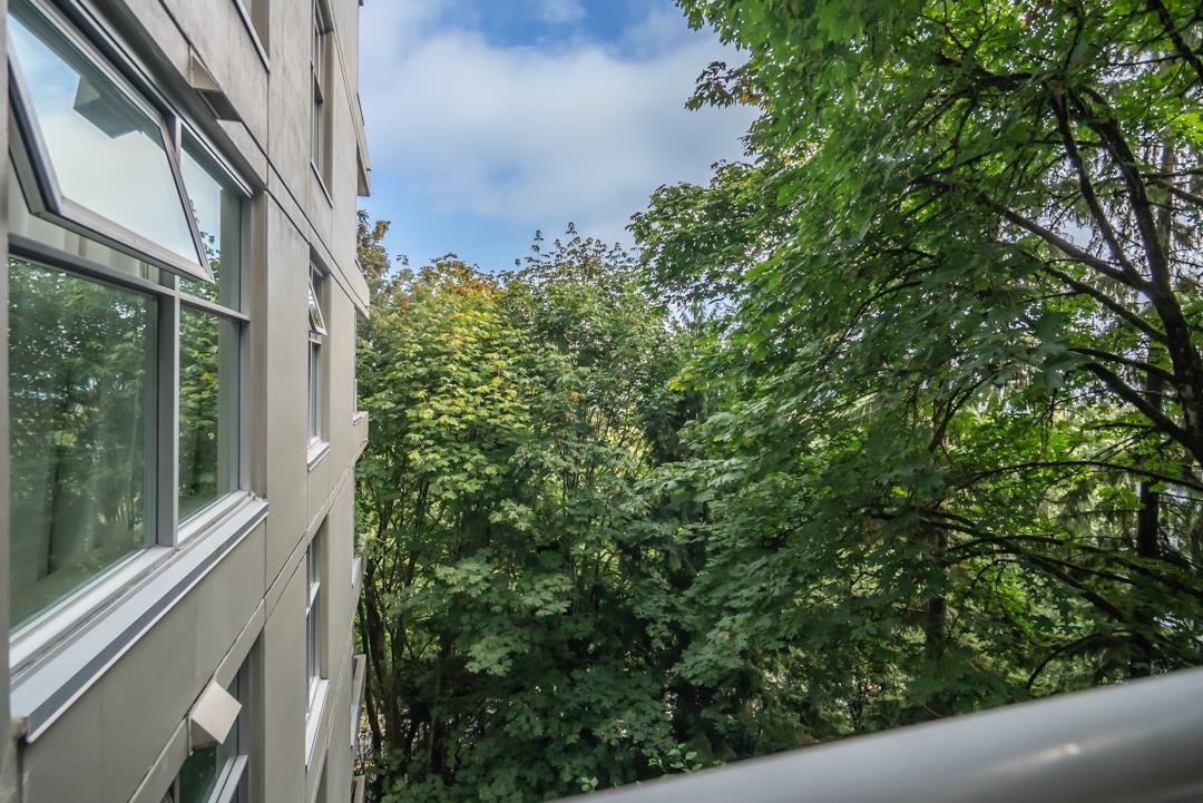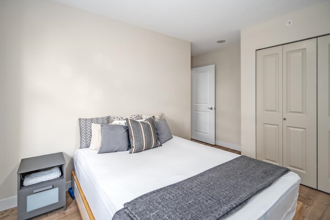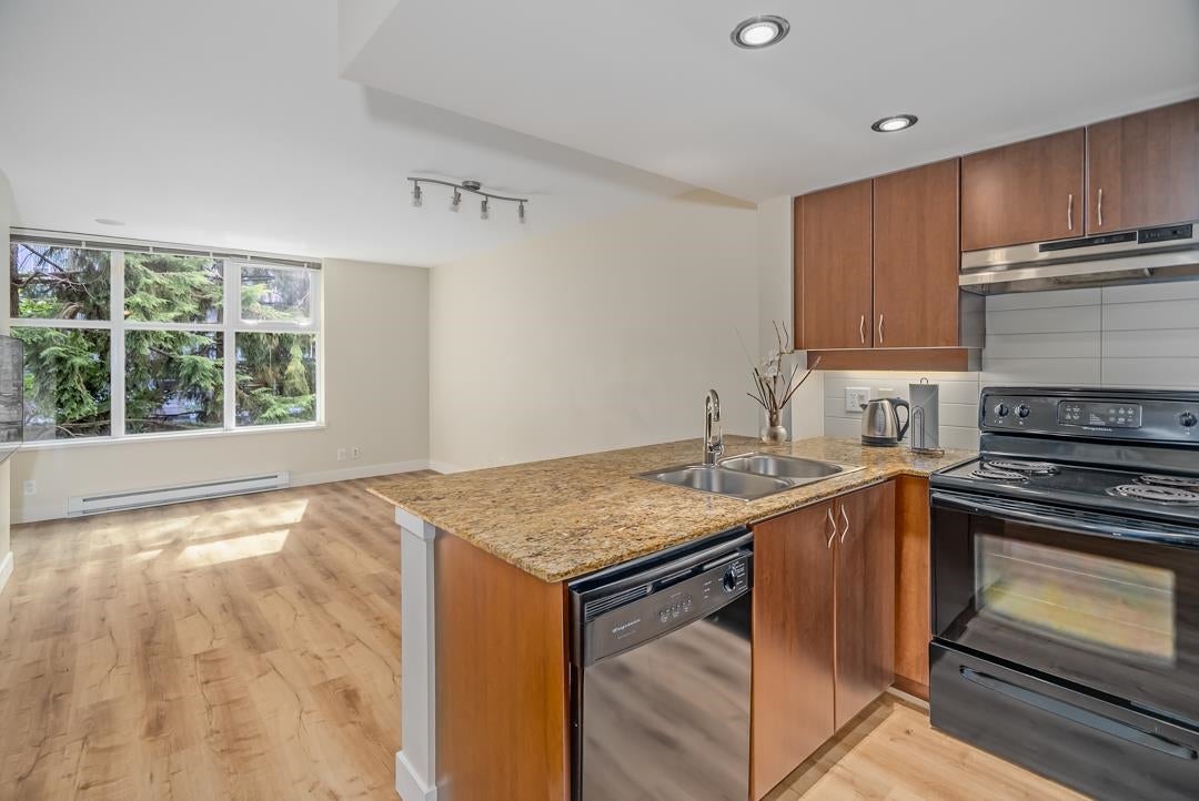Welcome to Novo 2! This beautiful 2 bed + Den, 1 bath unit in a fully concrete building is ready for you to move in! 804 sqft of living space and an excellent layout! Huge covered balcony with excellent view in fall/winter and privacy throughout the year. Open concept kitchen and living room with granite counters throughout! Large and bright primary bedroom! Good size full bathroom + in suite laundry. Brand new flooring throughout. Well run strata with a healthy contingency! All of this in a great location walking distance to SFU and everything UniverCity has to offer! Hiking trails, grocery, restaurants, coffee shops, shopping, and more!